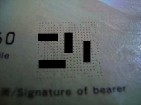 今年の3月20日からパスポートがICチップ付きの新しいのに変わりました。私も今年期限切れになるので更新しました。以前に「隠された文字」で旧パスポートに隠された文字の事を書きましたが、新パスポートではどうなっているのか調べてみました。所持人欄の罫線の隠し文字は健在です。新たに写真ページの模様に見える線を文字で書いてあります。査証欄に罫線が増えてここにも文字が。それから写真ページにレーザーで焼いて開けたような穴が あります。裏表紙にも焦げ目が付いているのでレーザーなのは間違いないでしょう。穴のパターンにパスポートの個人情報を含んでいると嫌なので写真では一部 を隠しています。これと同じ仕組みで各ページに通しでパスポート番号が穴で開いています。最後のページの所持人欄には焦げ目程度にしか見えませんが光に透 かして見るとちゃんと穴が開いていました。しかし、ICチップの入ったページが硬くて分厚いので扱いには気を使うことになりそうです。ジーンズの尻ポケッ トに入れたら駄目かもしれません。