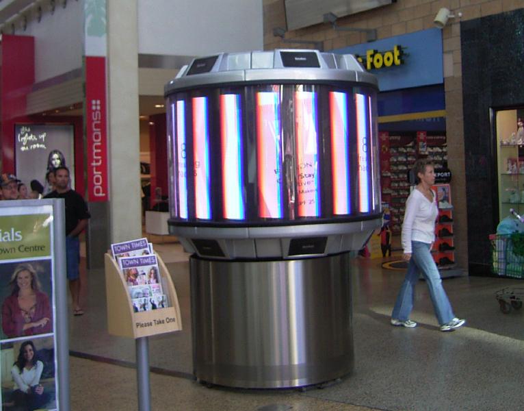 そこで円筒形のディスプレィを発見。写真では短冊に画面が切れているけど実際はちゃんと見えてます。中を縦長に配置した発光ダイオードが回転に同期た画像を表示しつつ高速に回転して表示しているらしい。