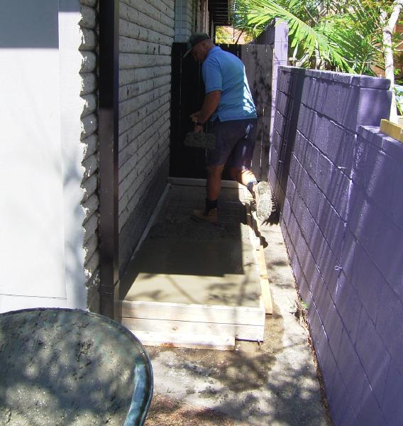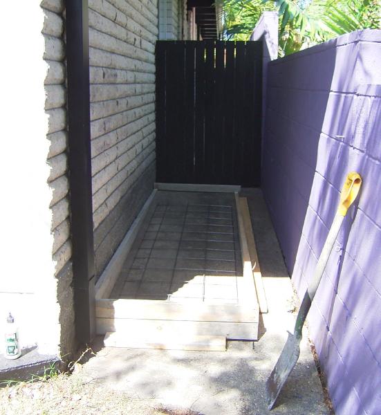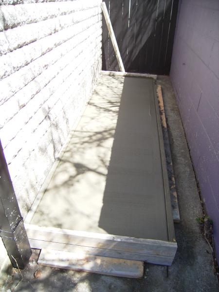 Rainwater Tank (1) 今日は朝の8時頃からRain Water Tankを置く場所のスラブ工事が始まりました。 本当は先週の金曜のはずだったのですが業者の都合がつかないということで今日に変更になっていたのでした。また延期されるかな~と思っていたけど、前日に来るよと電話で連絡があってその通りに来ました。 写真の影が物語っているとおり工事が終わったのは午後1時過ぎ。明日朝に型枠を外しに来るそうです。