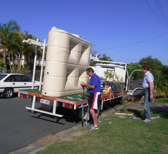 トラックからタンクを下ろすのに、そのまま落っことしてるんですね。で、そのまま2人がかりで台車も無しにそのままズルズル引きずって行っちゃって ます。(笑) まあ、水を入れるだけの頑丈なプラスチックタンクなのであまり気を使わなくてもいいのかもしれないけどね。こっちも10年保証が付いている のでいいんだけど、けっこうアバウトな搬入でした。