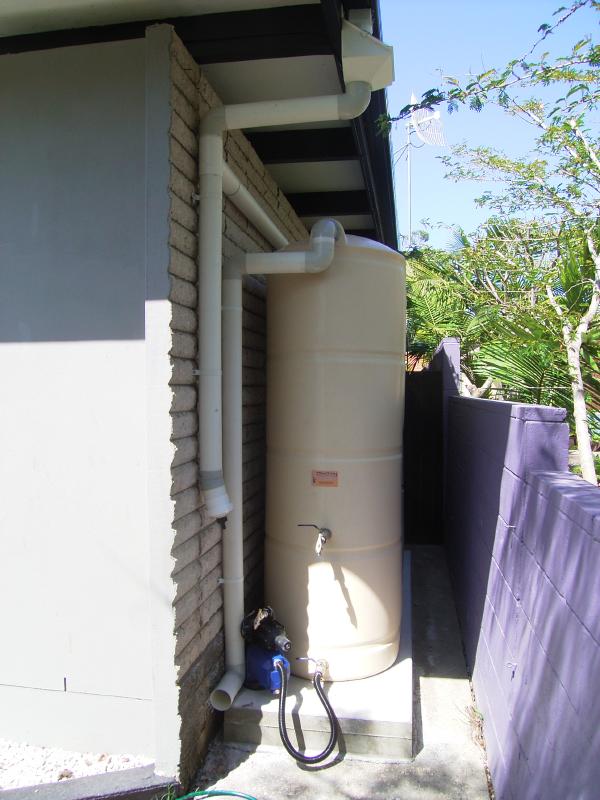 このRainwater Tankですが、 Home and Garden WaterWise Rebate Schemesという制度があって、2,000リットル以上の雨水タンクを規定に従って設置すると1,000ドルのリベートがQueensland政府から支給されるのです。さらに、Gold Coast City CouncilがGold Coast Home Watersaver Rebate Schemeと いう制度で200ドルを支給してくれます。今回設置したのは家と塀の隙間に規定の空間を残して入る最大のタンクで3,000リットルの容量があります。結 構な大きさに感じますがウチのプールの水位にして10cm強くらいの量に相当しますので水を足すのにこれくらいは必要でしょう。