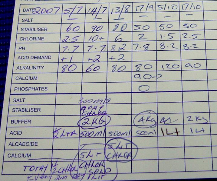 毎日400mLのchlorine投入だとボトルが空になるのが早い。プール屋に詰め替えてもらいに行く。先日来の土砂降りの雨のおかげで雨水タン クにほぼ満杯の水が溜まったのをプールに継ぎ足したにもかかわらずchlorineは丁度いい水準。前回acidを加えたにもかかわらずPhが8.2で変 わらず。今回のレシピはバッファを2kgとacidを1L投入のお達し。でもchlorineは300mL/dayで充分なんじゃないのかな? 400mL/dayから減らしてみよう。