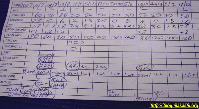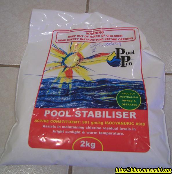ほぼ週一のプール屋通いです。Acidを1L投入と今回初顔のSTABILIZER(ISOCYANURIC ACID)を1kg投入がレシピ。それと雨が降って水が新たに入ったらChlorineを多目に入れるようにとのアドバイス。STABILIZERは太陽光による塩素の消費を抑えて塩素濃度を安定させる働きを します。プールのメンテを始めて半年近くになりますがここへきてSTABILIZERのレベルが下がってきたので投入と相成りました。ゴマくらいの大きさ の顆粒状の薬で溶解速度が遅いのでポンプの取水口のごみとりカゴに放り込んでゆっくり溶かします。Chlorine補充が3.50ドル、Acidが 8.95ドル、Stabilizerが2kgで16.50ドル、計28.95ドル也。夏場は結構薬代がかかりそうです。