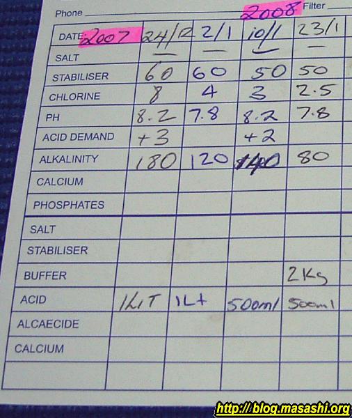 プールのメンテ(21) いつもどおり、Chlorineのrefillとphバッファ2kg。 今のところ500mL/dayでChlorineを投入してるけど濃度が下がってきてるのでこれから晴れが続くようなら少し増やした方がいいかもしれない。refillが3.5ドル、バッファが7.5ドルで〆て11ドルなり。