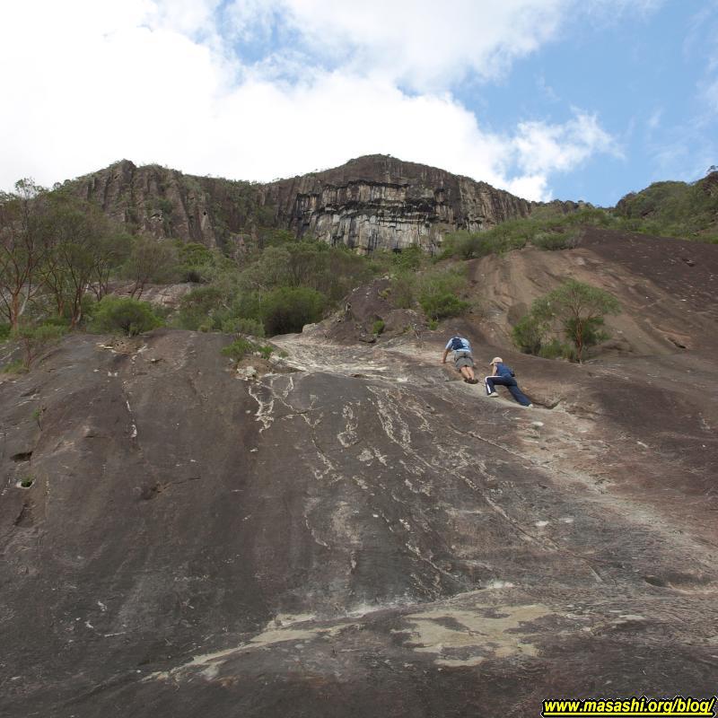 岩肌の下までは遊歩道が付いていて行くことができます。そこからはこんな感じの道(?)。カップルが岩肌に取り付いていますが、これは途中まで登ってみたのはいいけど彼女の方が怖くて降りてこれなくなっているところです。見た目は難しくなさそうなのですが、彼らが無事降りてから娘と二人で同じところまで登ってみると、確かに恐いです。登るのはともかく降りるのは足場が全然見えなくて慣れてないと駄目ですね。さっきのカップルと同様、娘に足の置き場所を指示してなんとか降りてこれました。丁度、降りてきたらところに今度は4人兄弟の子供を連れたお父さんが私たちを見て登り始めました。5分後にまた一番上のお兄ちゃんらしき子供がもっと上まで上がって降りてこれなくなってお父さんがあれこれ下から指示して同じ目に遭ってました。(笑