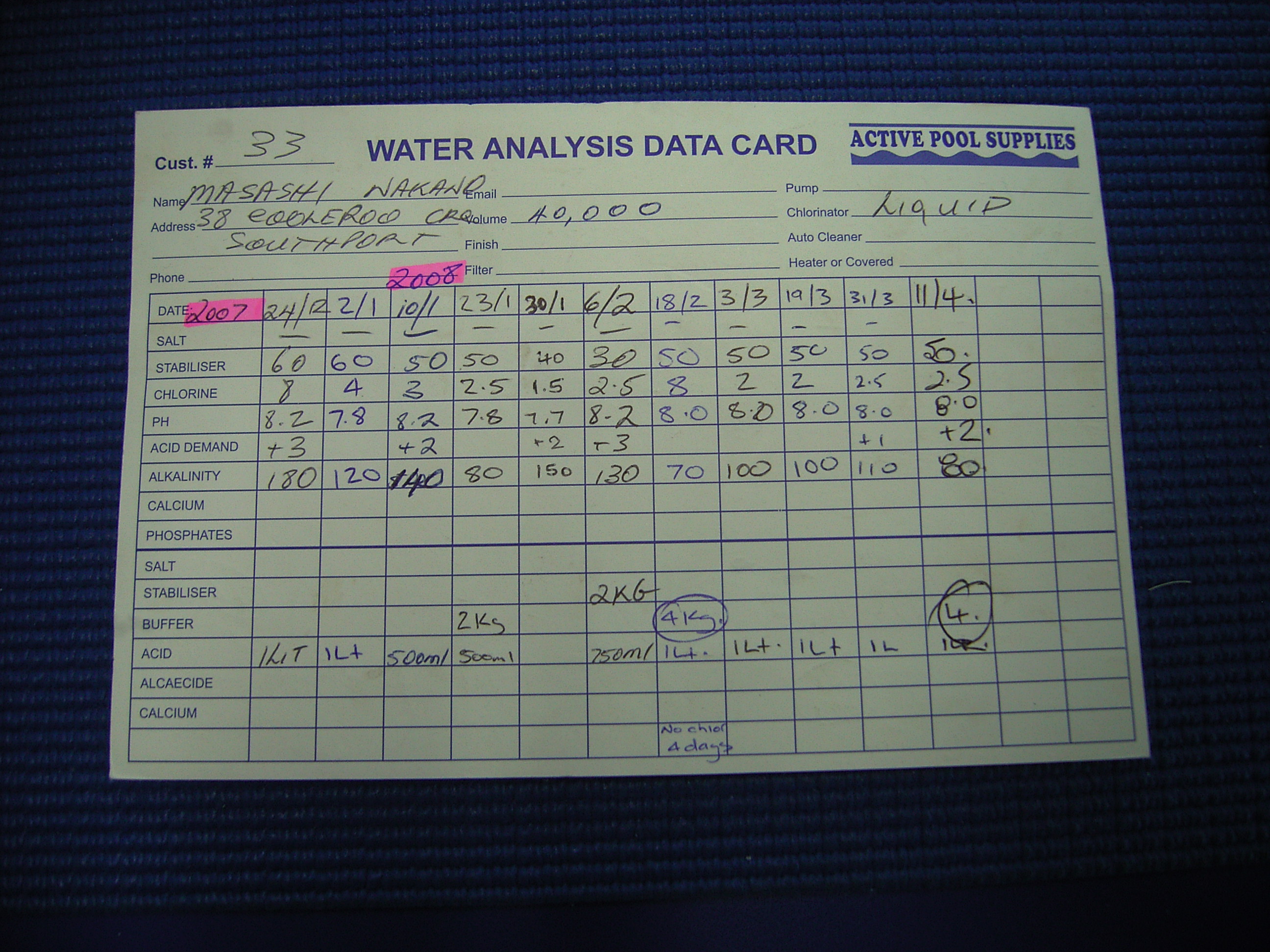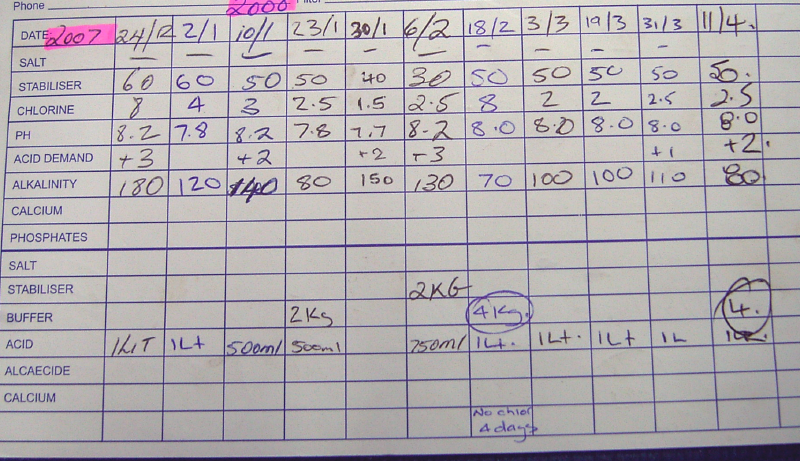 プールのメンテ(28) Chlorineが無くなったのでプール屋へ。ここのところ毎日350mLのペースで投入してます。水の検査結果はphバッファ4kgの投入と次の日にacidを1L投入でOKとのこと。chlorineの詰め替え3.5ドル、phバッファ12.5ドル、acid 5Lボトル8.95ドルの計24.95ドルなり。