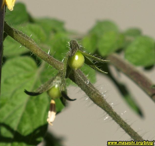 プチトマト 去年に鉢に種を蒔いて芽は出たものの、青虫に葉が食われたり、水が足りないのか枯れたりして満身創痍の状態だったプチトマトがここにきてしっかりとしてきました。先日、花が咲いてその後に実が育ってきました。