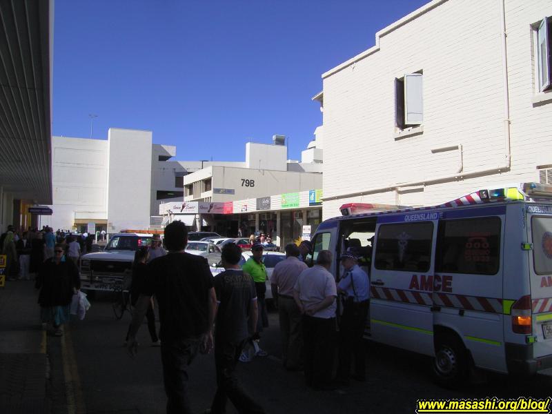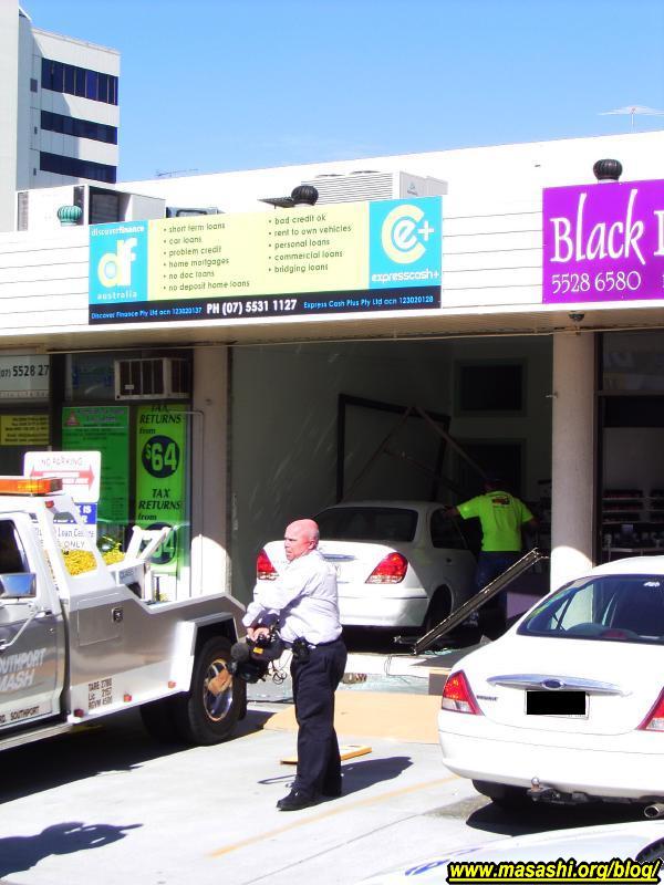 TAFEの授業の合間の休み時間にAustralia Fairの近くで救急車と人だかりが。何だろうと行ってみると車が事務所に突っ込んでいます。テレビカメラも2社ほど来ていました。その場にいた日本人の人の話では彼の友達の車が突っ込んだのだそうで、その友人は運転にかなり自信が無い人だそうでアクセルとブレーキを踏み間違えてしまったようだ、とのことでした。事務所のガラスはめちゃくちゃでしたが、運転手の怪我は大したことはなさそうで車もそれなりに少し傷がついた程度でレッカー車で引っぱり出した後は自力で動ける状態でした。まあ、それにしても見事に事務所に綺麗にすっぽりと突っ込んでますね。