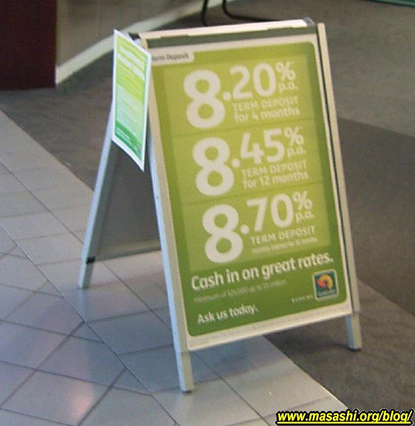 今度は8.7%! 先日の「8.5%」に引き続き今度は8.7%の看板が別の銀行の店頭に出てました。写真が不鮮明ですが、36ヶ月定期で毎月利息が支払われるタイプです。12ヶ月でも同じ水準の利息です。ちょっとまとまった資金を預けておけば毎月結構な額の小遣いになりますね。
