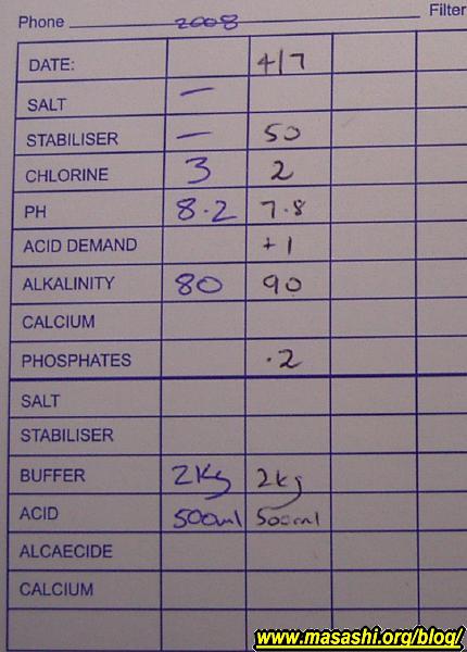 今日のレシピはacid 500mLとph buffer(重曹)を2kg投入でした。毎日のchlorineは現在200mLです。