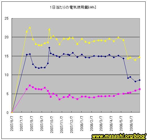 ちなみに、ブルーの線は一般電力でピンクの線は温水器の電力です。黄色は合計です。温水器の電力は1年の気温の変化に応じて変化しているように見えます。