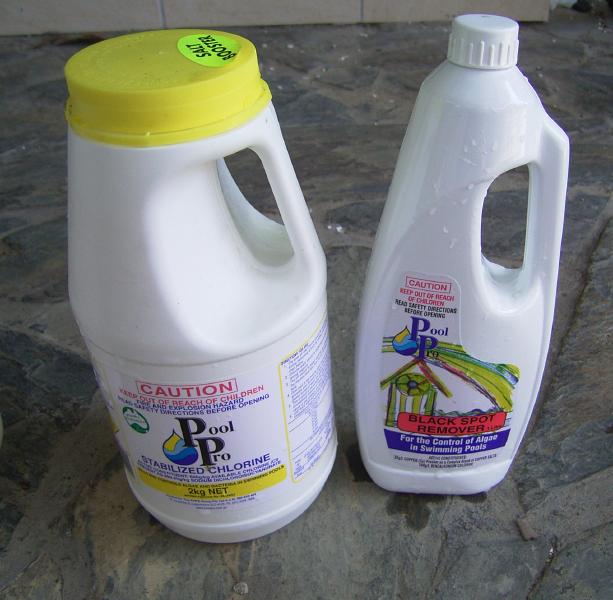 と、結構な出費。 まずAcidを1.5L投入。続いて2kgのSTABILIZED CHLORINEと1LのBLACK SPOT REMOVERを投入したらあ~ら不思議、あっという間にブクブクとプールが泡立ったかと思うと緑色は消えて白濁しているものの水は綺麗になってしまいました。白濁は藻の残骸なのであとはひたすらポンプを回して透明になるのを待ちます。