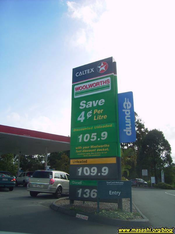 ひと時大分高かったガソリンの値段が下がってきました。WoolWorthsの4セント割引クーポン価格で105.9セントでした。円高とあいまって日本円にしてリッター約67円です。