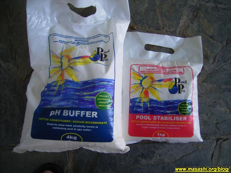 午前中にStabiliserとBufferとChlorineを投入して午後は我家のプール開きの日となりました。明日投入するのが面倒なので泳ぎ終わってからAcid 500mlを投入と水が濁ってきたのでClarifierを600ml投入。