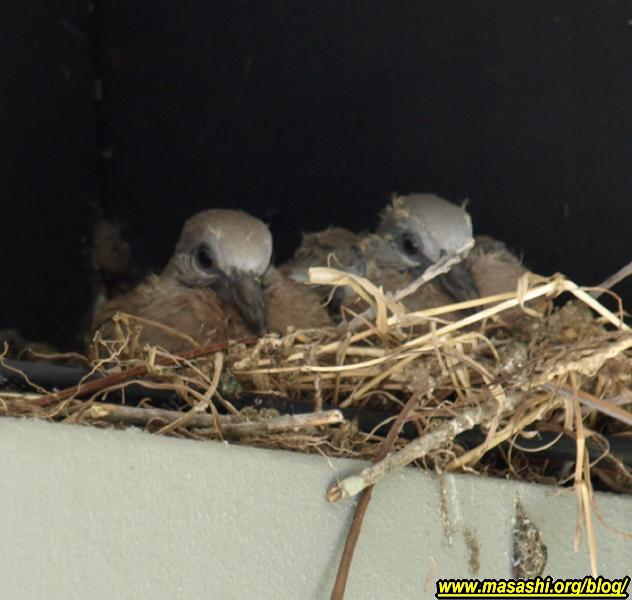 ハトのヒナ 1月頃からハトが家の軒下に巣を作って住み着いていました。しばらくの間、いつもても巣にハトが鎮座していてよく鳴いていたのできっと卵を暖めているのだと思っていたら、ちょっと前からヒナが孵っているのが分かるようになりました。 ちょっと下からは見えにくいのですが親鳥のいない隙を狙ってイスの上に乗って望遠レンズでヒナの姿を捉えました。もうかなり大きくなっています。巣立つのももうすぐでしょう。