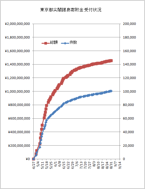 寄付金受付開始からわずか1ヶ月で10億円突破した東京都尖閣諸島寄付金のその後ですが、8月28日の時点でついに10万件を突破しました。本当は10万人突破と言いたいところですが、一人で何回も寄付した人がいたりするらしいのであくまでも件数です。金額の方も14億5千万円にもなっています。さすがに最初の勢いこそ無くなってきていますが、それでも毎日数百万円ペースで増えていってます。全期間平均で1件あたり約1万4千円、8月中の平均でも1件あたりの平均が約1万円を保っています。寄付金の増え方としては稀有な状況が続いていると言えるでしょう。しかもグラフをよーく見てみると8月辺りから増加ペースが若干ですが増えているように見えます。きっと何かあったのでしょうね。(笑