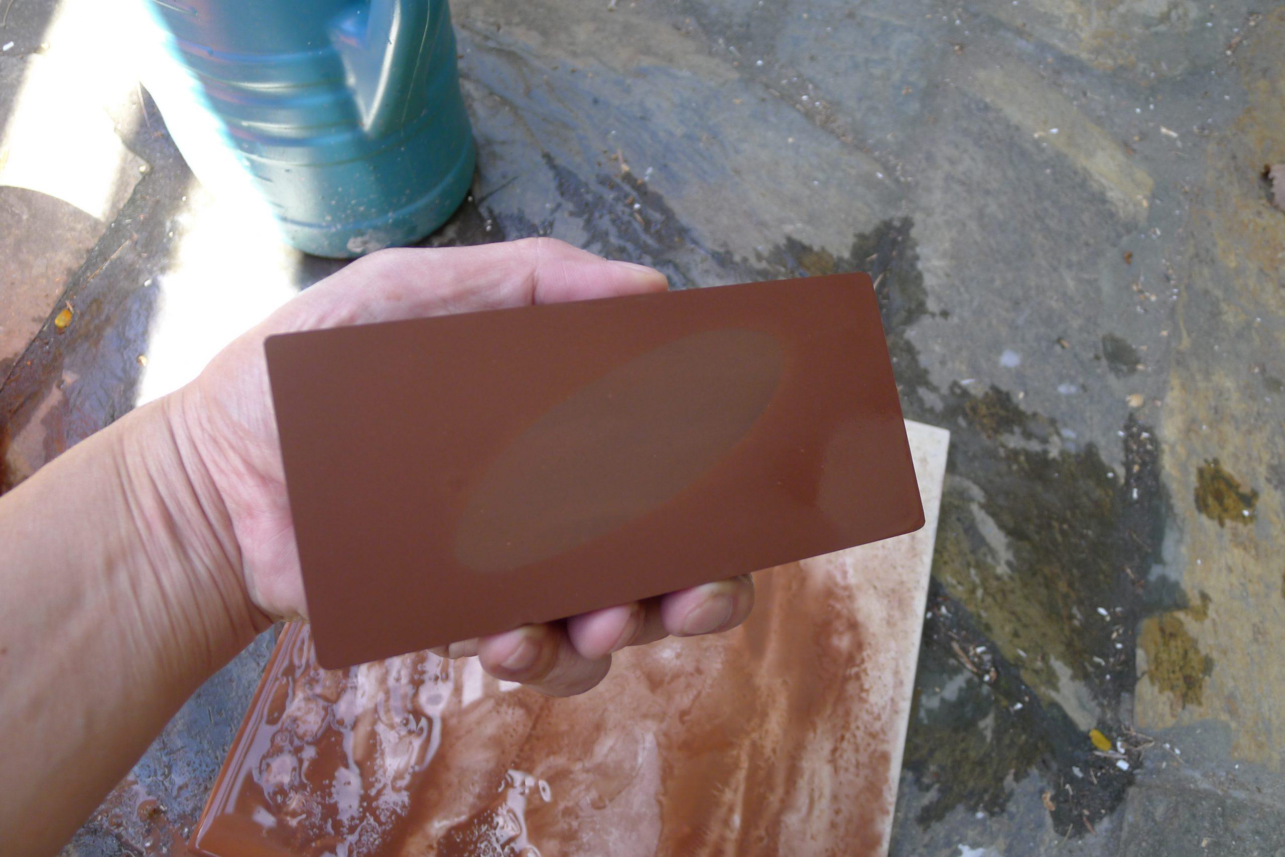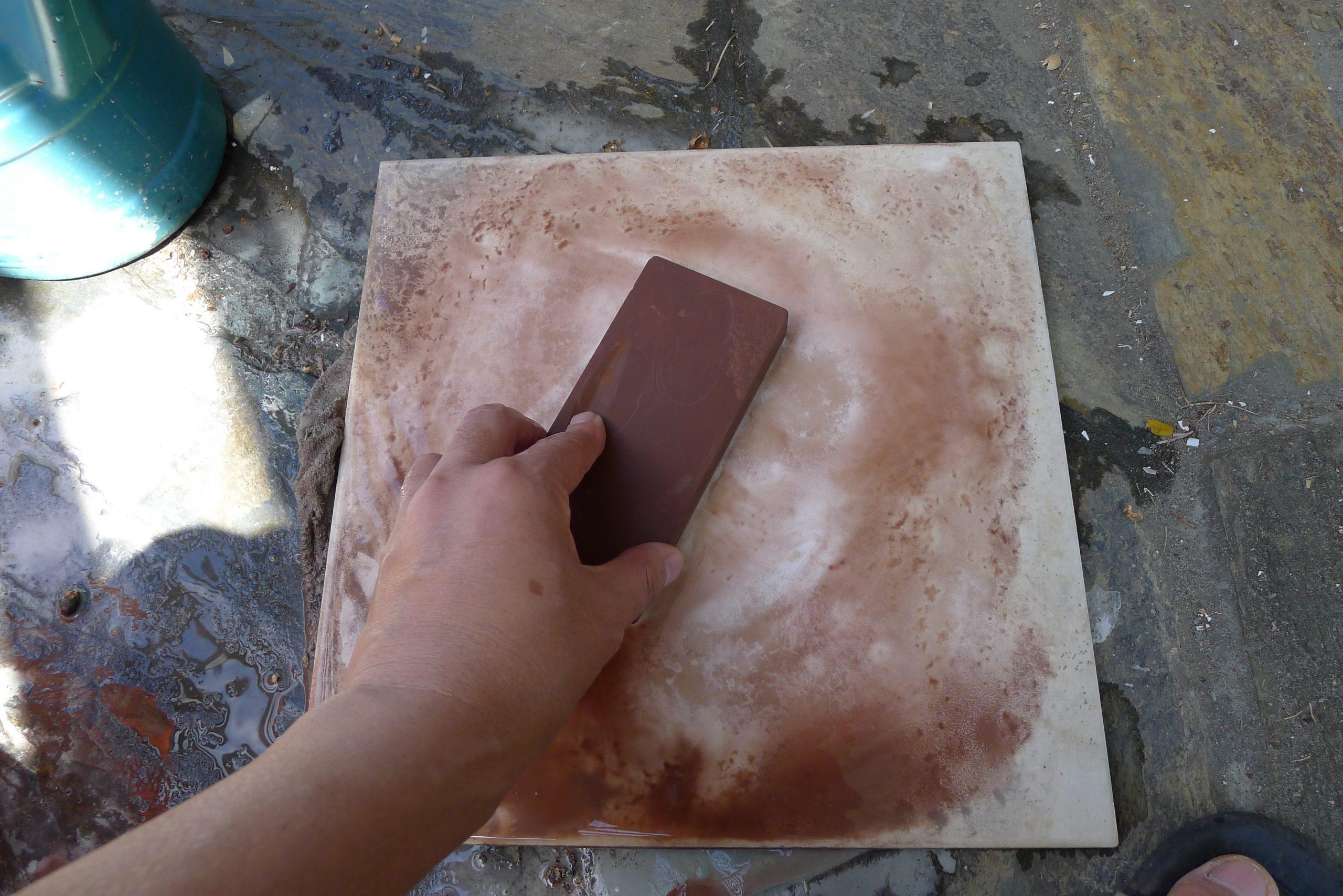 これが最初の砥石の状態です。凹みがよく分かるように少しだけタイルで擦ってます。以下順に擦るにつれてだんだん凹んでいる範囲が小さくなってきます。