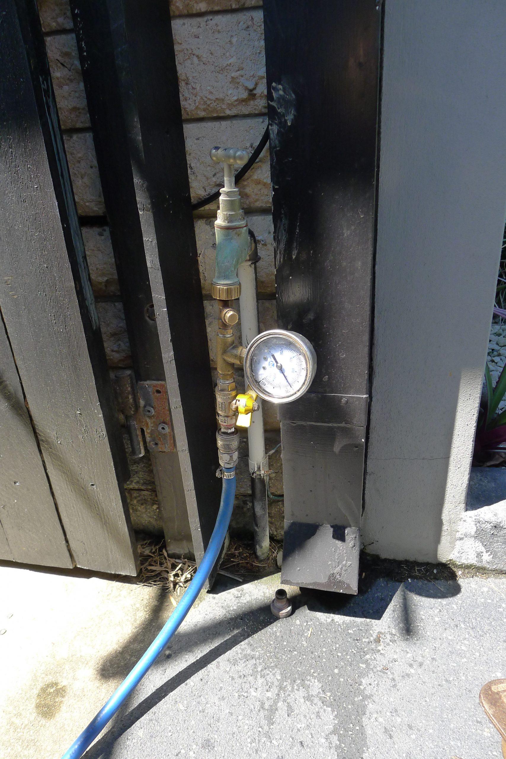 そして昼過ぎに来てくれました、plumberさん。彼に水道メーターの読みで水漏れしているのは分かっているけど、どこで水漏れしているのか分からないということを説明しました。早速水道の元栓を閉めて写真のように外の蛇口に水圧計とホースをつなぎ、車に積んであるポンプで水圧をかけます。