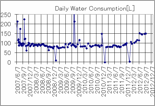 このグラフは一人1日当たりの水道消費量です。3人家族なので実際の消費量はこの3倍になります。時々みられるピークやドロップはプールに水を足したりしばらく留守にしてたりの影響です。水道メーターの交換作業が6月6日にあり、その日を境に消費量が急に増えています。また、それ以前からも2011年9月頃から少しづつ増加傾向にありました。単にメーターを交換しただけで急に増えるのはちょっと解せませんし、それまでの増加傾向も特に水の使い方が変わってきたという訳ではないのでこれも解せません。今まで90リットル/日だったのが150リットル/日で、1日に約180リットル消費が増えたということになります。これはどこかで水漏れしている可能性大なので、家中の蛇口を全部閉じて水道メーターの値の変化を見てみました。その結果…