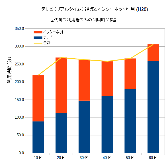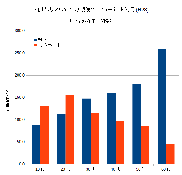10代が少ないのは恐らく勉強の時間など他にすることが沢山あるからでしょう。60代はリタイアなどで自由時間が増えているのでしょうね。しかもテレビの利用時間分だけで他の世代のテレビとインターネットを合わせた利用時間分よりも多くなっていて、インターネット利用時間がごくわずかということが特徴的です。