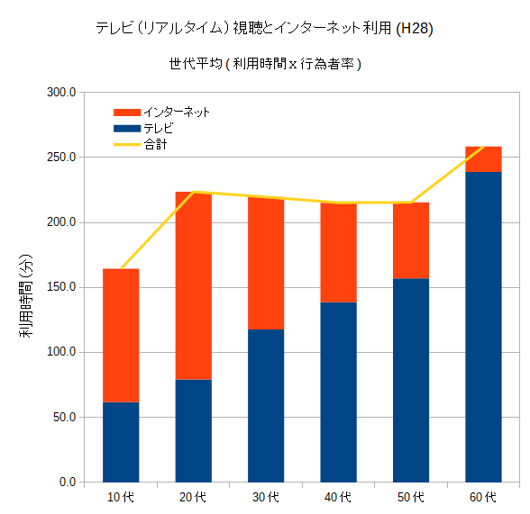 これだけを眺めると確かに若い世代ほどテレビを見る時間が短くてインターネットを利用している時間が長いという傾向は分かります。これは多くの人が何となくそうなんだろうなという事と一致していると思います。ただそれが分かっただけだと面白くないので、テレビとインターネットの両方の利用時間を積み上げてみました。以下がそのグラフです。