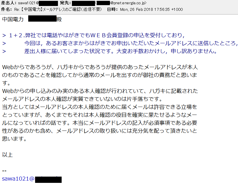 メールは「差出人 様」で始まってますね。こちらが名乗ってないのでこれは問題なし。メールアドレスの登録も削除すると言ってるのでOK。でも、フッタも何もない素っ気ないメールですね。仮にも中国地方を統べる電力会社でしょう。ちゃんと部署や名前を名乗ったメールを出した方が良いと思いますよ。かろうじてFrom:欄にはお名前が書いてありましたけど。
