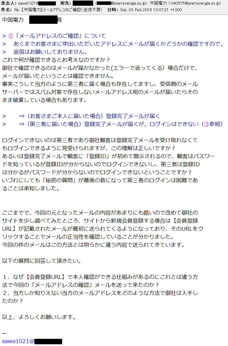 メールは「差出人 様」で始まってますね。こちらが名乗ってないのでこれは問題なし。メールアドレスの登録も削除すると言ってるのでOK。でも、フッタも何もない素っ気ないメールですね。仮にも中国地方を統べる電力会社でしょう。ちゃんと部署や名前を名乗ったメールを出した方が良いと思いますよ。かろうじてFrom:欄にはお名前が書いてありましたけど。