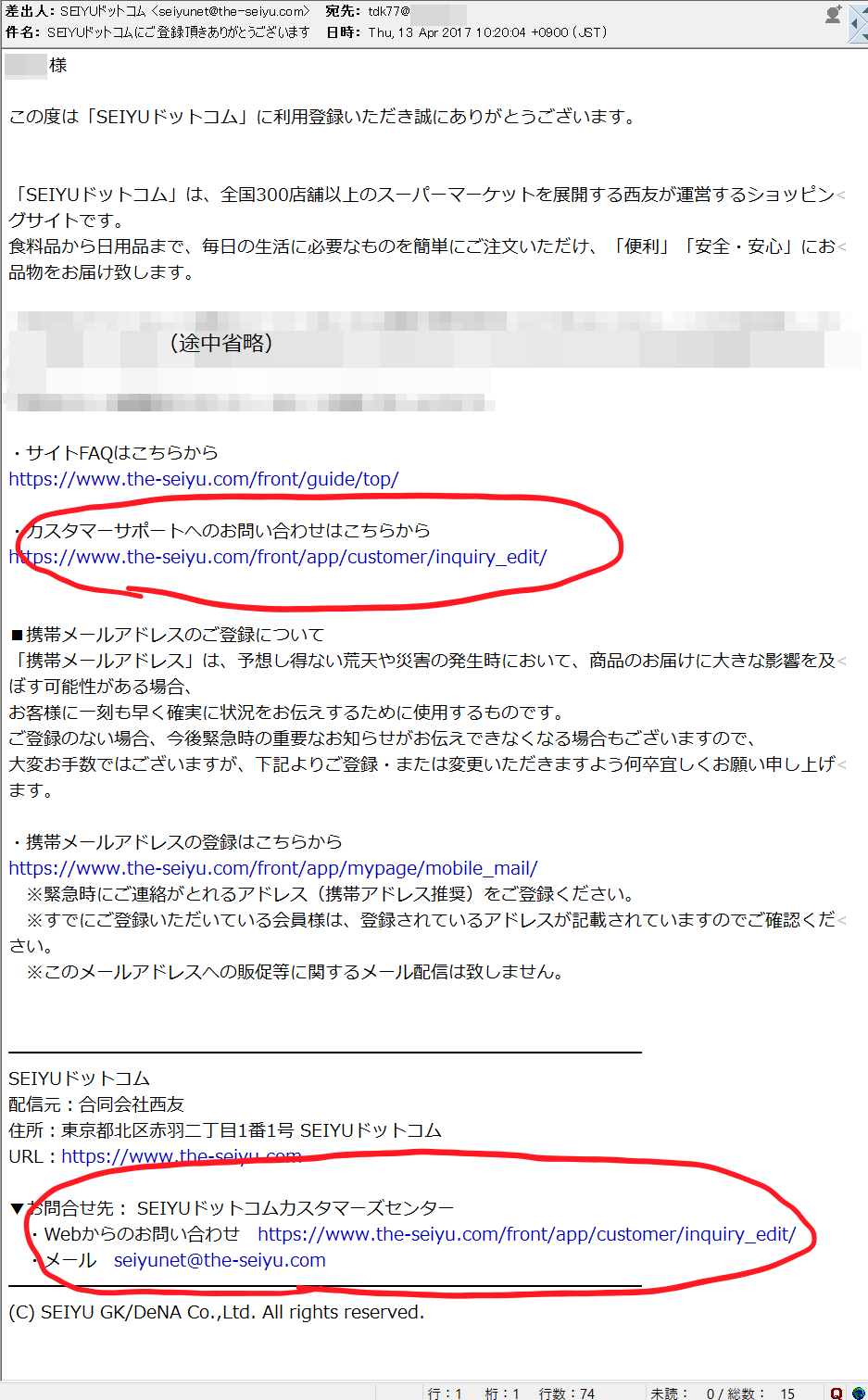 差出人は「SEIYUドットコム」というところからです。このメールには差出人の情報表示があり、カスタマーサポートへの問い合わせリンクが二か所にあります。「覚えの無いメール」についての記述が無いのが気になりますが、問い合わせることはできるようです。
