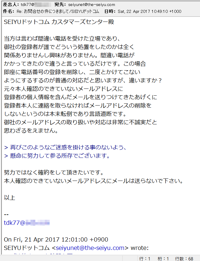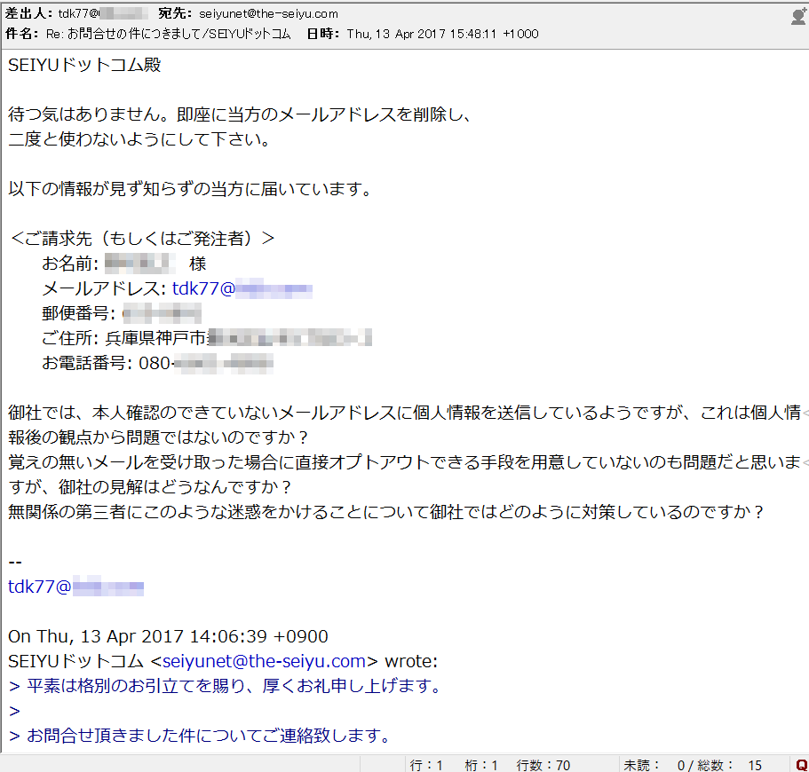 このメールが「SEIYUドットコム」に届くことで初めて、当該メールアドレスが彼らの「顧客」のものではなく「お問い合わせをしてきた匿名の人物」のものだということが確定します。