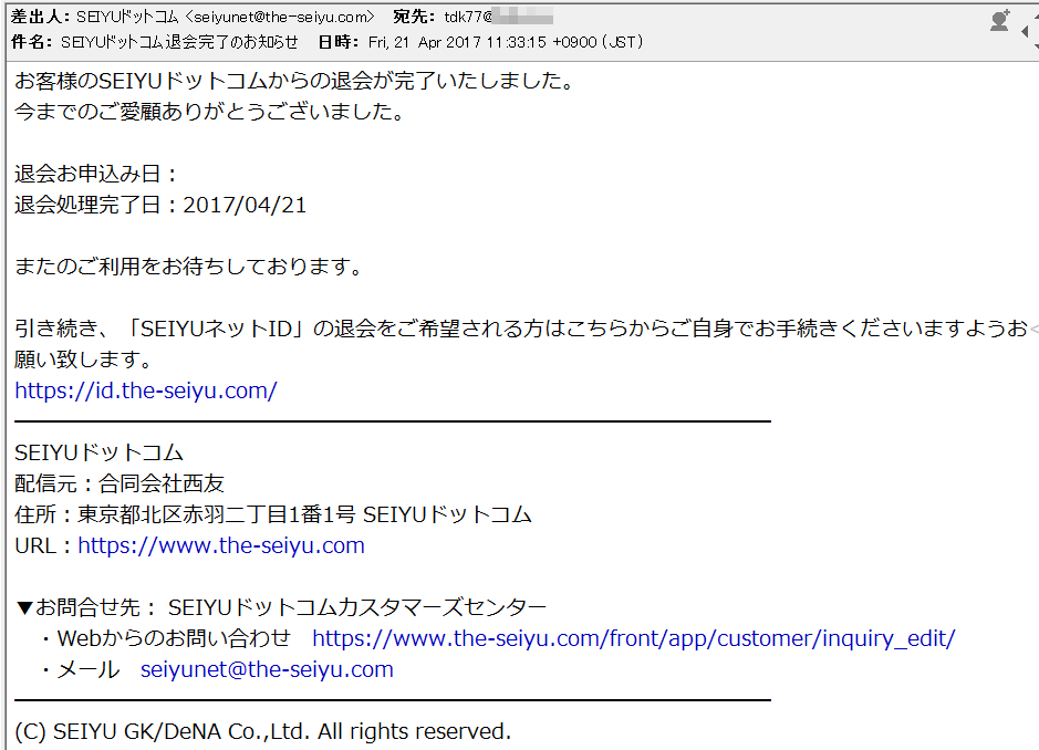 4月21日11時33分に「SEIYUドットコム退会完了のお知らせ」という自動送信メールが届きました。