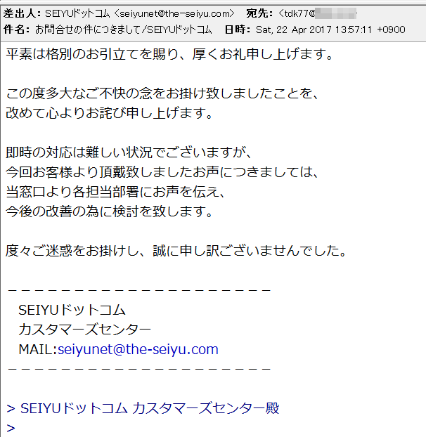 「SEIYUドットコム」にしてみれば、Webからの見知らぬ匿名の問い合わせに対して、最初に送るメールの内容としては適切なものでしょう。