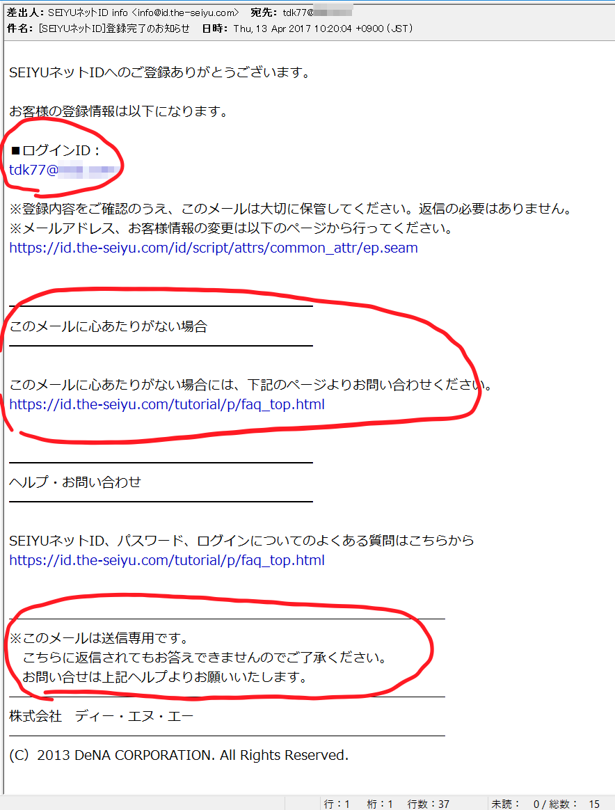 題名が「[SEIYUネットID]登録完了のお知らせ」でこちらが何もしていないうちに「私のメールアドレス」で登録が完了してしまったようです。これはちょっとまずいですね。