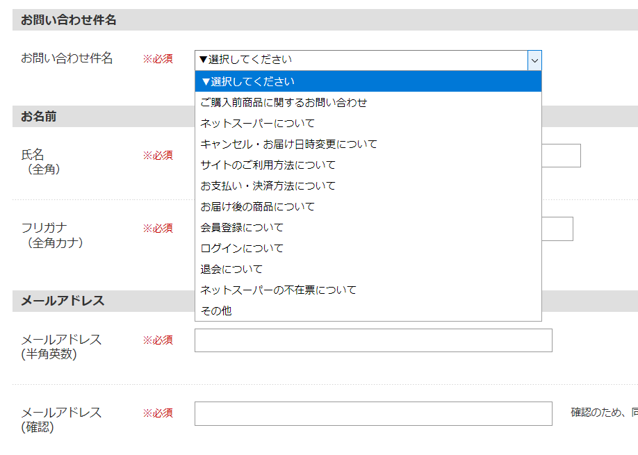 ところが、「お問い合わせ件名」の選択肢の中には「覚えの無いメール」に類する件名が用意されていないんですよね。それから、覚えの無いメールを受け取った側としては「こちらの個人情報を積極的には提供しない」という方針があるので、「氏名」「フリガナ」の記入欄が「必須」というのは納得がいかないですね。