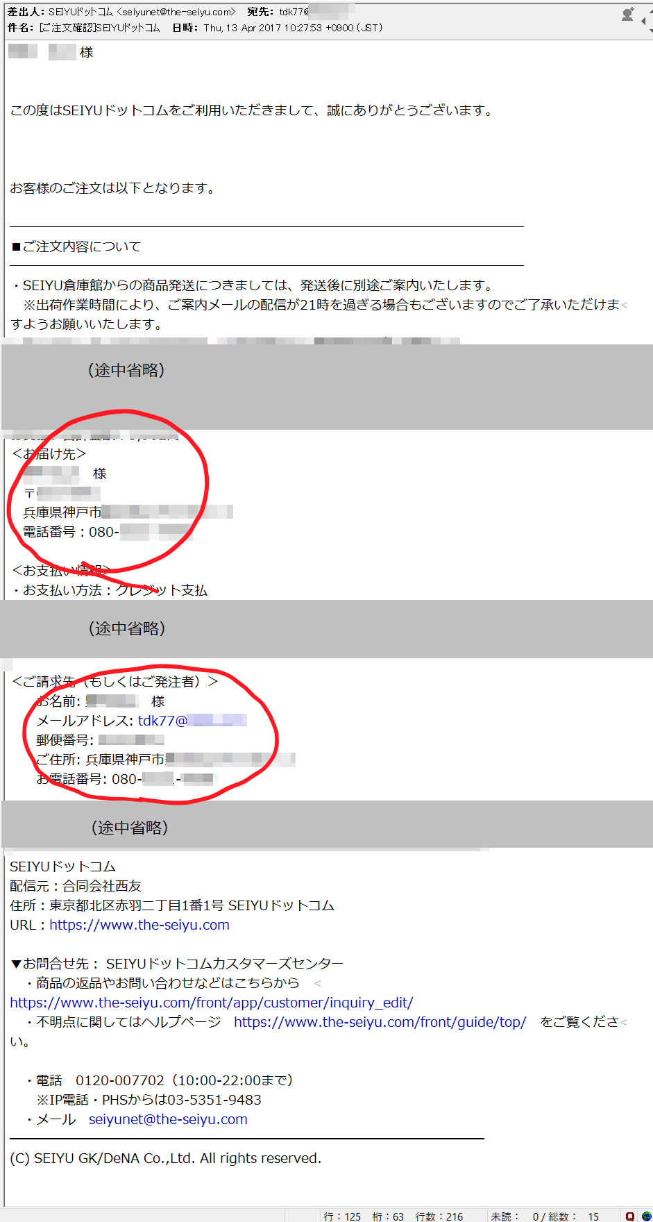 長いので途中省略しています。赤印の部分に注目してください。住所氏名電話番号が記載されています。何を何個注文したかなども当然全部メールに書かれています。