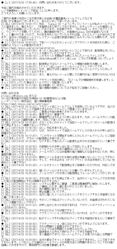 レノボから宣伝メールが送られ始めてから4日後の2017年4月28日夕方にレノボとチャットをしました。