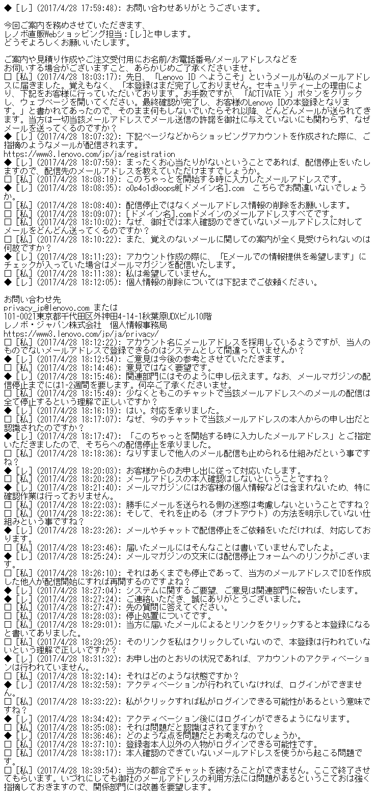 以下はその時のチャットの記録です。双方の名前やメールアドレスは書き換えてあります。明らかだと思いますが、[私]が私で、[レ]がレノボです。